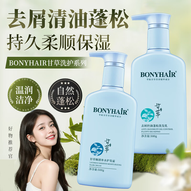 BONYHAIR邦妮甘草柔顺顺滑洗发水去屑控油蓬松套装正品官方品牌持久留香味 【25年新款】去屑控油蓬松洗发水 500g*2瓶