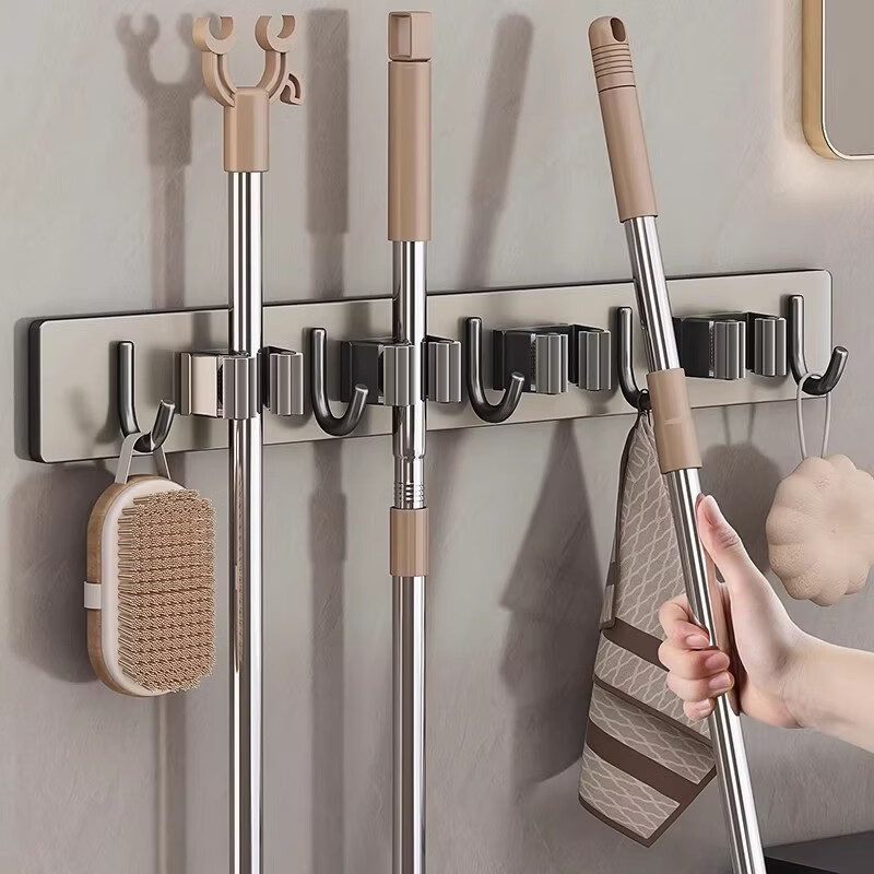 吱凡日本拖把壁挂夹不锈钢挂钩免打孔强力粘胶卫生间扫把收纳固定神器 【4夹5钩】枪灰色【防水防绣-掉落包赔】
