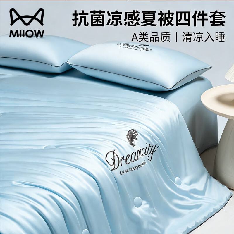 猫人(MiiOW)A类冰丝夏凉被四件套床上用品夏季床单空调被凉感夏被裸睡高级感 刺绣-天空兰【双面凉感冰丝可机洗】 床单款 四件套-夏被2.0x2.3m+床单+枕套*2