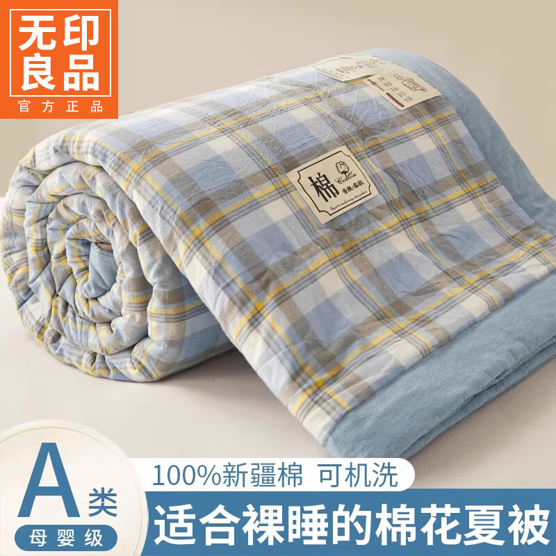 无印良品A类新疆棉花被子春秋空调被1.5x2米宿舍单人夏凉被可机洗裸睡棉被 格韵-蓝灰【100%新疆棉 适合裸睡】 150cmx200cm单夏被