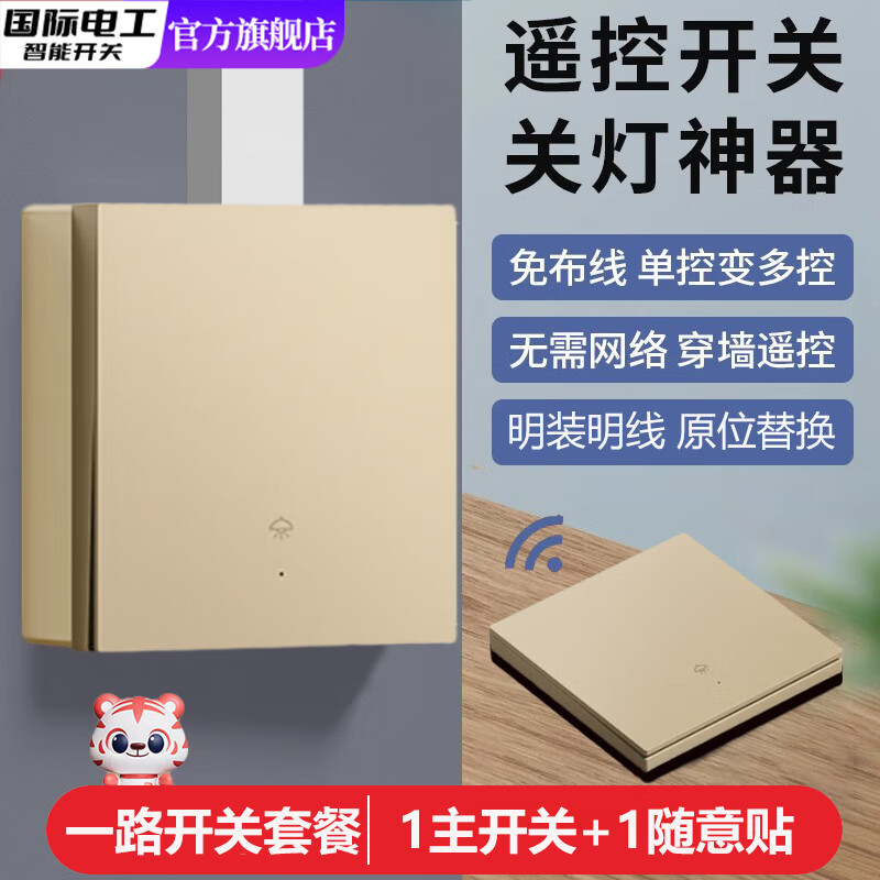 国际电工明装无线遥控智能开关免布线家用卧室灯具远程随意贴220V子母开关 【明装金】1开主开关+1开随意贴