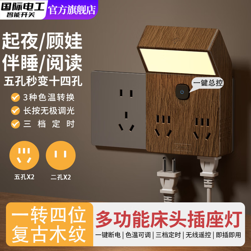 国际电工遥控照明灯床头书桌复古86型一转四多功能扩展插座直插式转换插头 【木纹】一转四带灯扩展插座