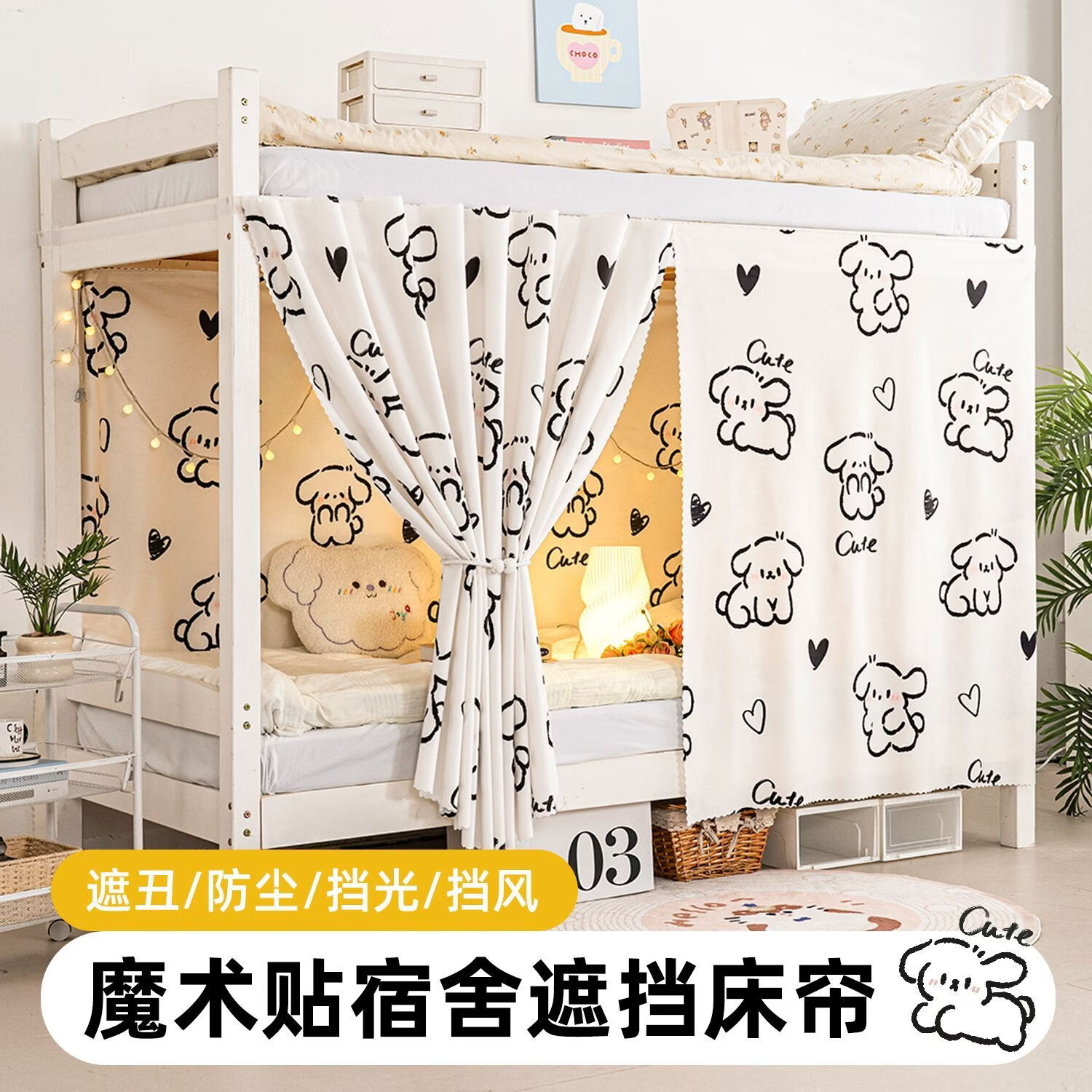 高睿宿舍下铺防尘顶寝室高低床免安装魔术贴隐私防尘床帘单人印花床帘 蹦跶线条狗【遮丑防尘-柔和遮光更透气】 1.15m高*2.0m长-两片帘【遮挡正面+侧面】