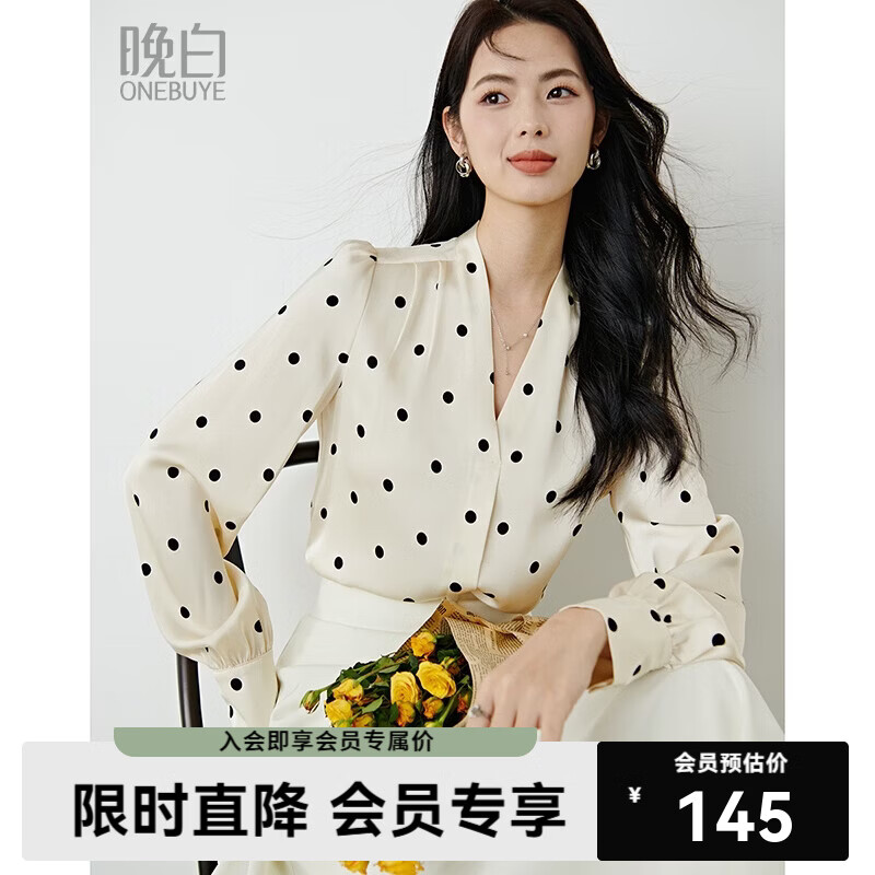 晚白【新品】法式V领波点衬衫女2026春款奶油风上衣垂顺通勤百搭衬衣 杏色 L