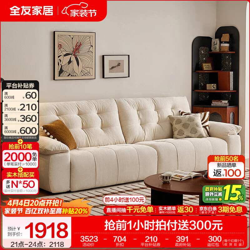 全友家居飞鸟沙发雪尼尔布艺沙发客厅2026新款可拆洗小户型直排沙发 【全拆洗A类10防雪尼尔 | 云朵白】2.52米沙发