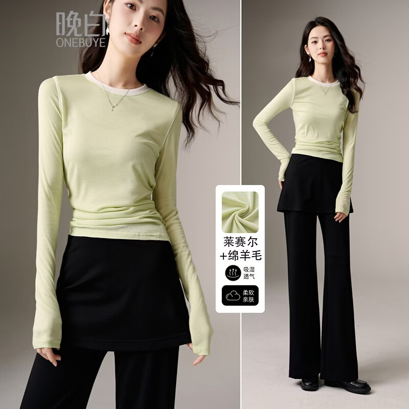晚白【断码清仓】时尚撞色清新休闲上衣莱赛尔亲肤舒适T恤衫女 淡绿色 L