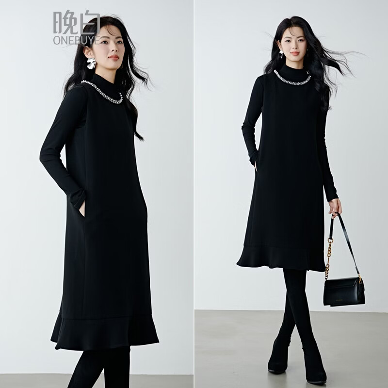 晚白【新品】时尚钉珠优雅小黑裙垂顺修身气质无袖连衣裙 黑色 S