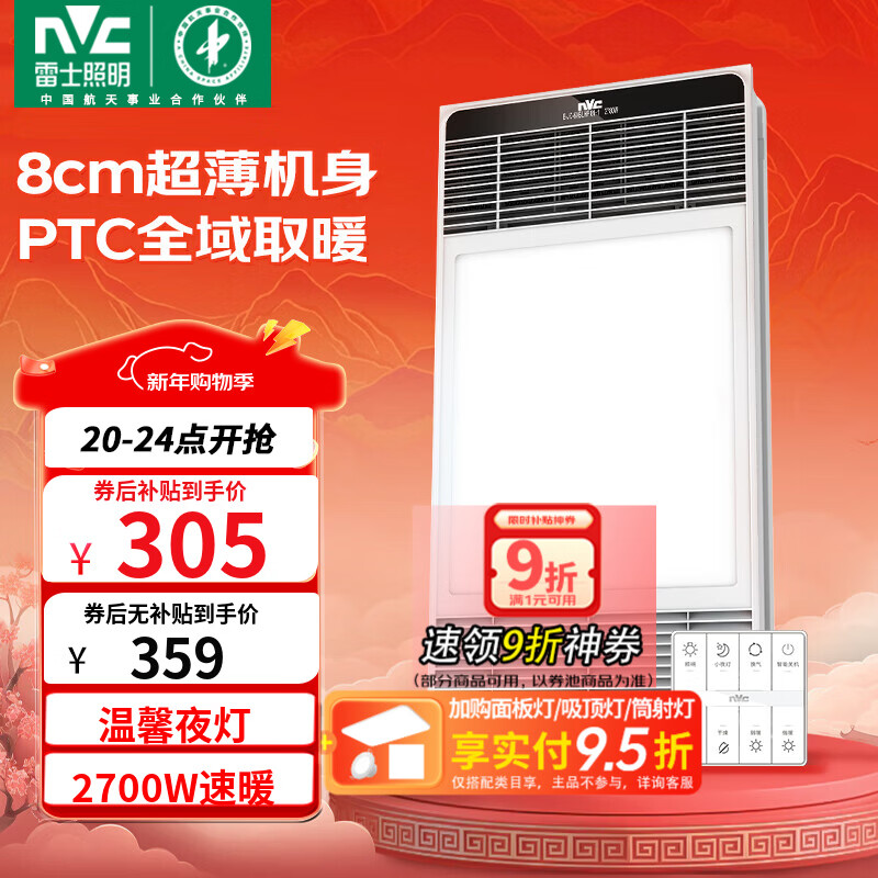 雷士(NVC)浴霸风暖大功率集成吊顶暖风机排气扇照明灯一体卫生间浴室Y295 【2700W】8cm轻薄机身