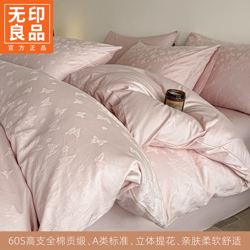无印良品高端全棉床上四件套纯棉提花被套家用裸睡床单被罩床笠款床品套件 迷蝶-唯美粉【60S全棉水洗棉 不缩水不起球】 1.8m 床单款 四件套-被套200x230cm