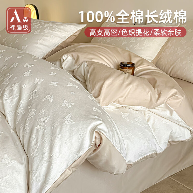 无印良品全棉长绒棉床上四件套纯棉被罩高端轻奢高级感床单被套床笠款套件 迷蝶-奶米杏【A类亲肤裸睡级-新疆一级长绒棉】 1.8m 床单款 四件套-被套200x230cm