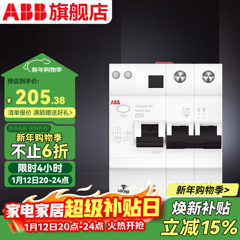 ABB断路器 新一代CR系列2P空开带漏电保护器6000安高分断 AC型 2P 32A带漏保