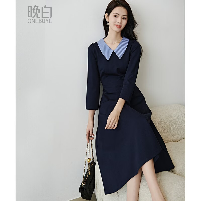 晚白2026年春款撞色拼接衬衫领裙子遮胯显瘦职场通勤带口袋减龄连衣裙 深蓝色 XL