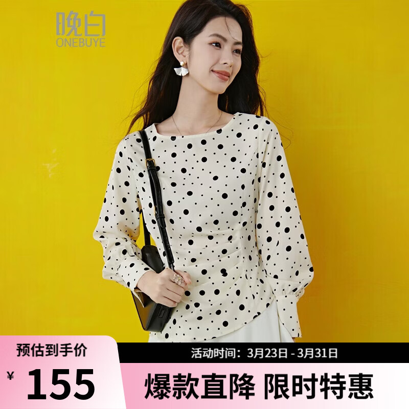 晚白2026年春款一字领法式波点上衣收腰遮肉气质通勤设计感压褶衬衫女 浅杏色 L