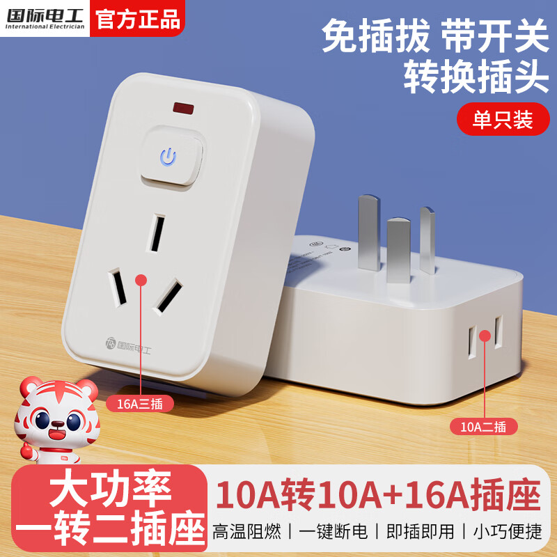 国际电工10A转16A三孔转换插头大功率空调热水器带开关转换器一转二插座 10A转10A+16A带开关【1只装】