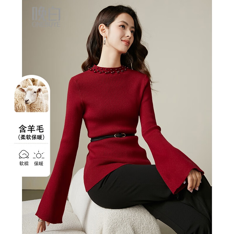 晚白【新品】骐骥红冬款时尚含羊毛柔软舒适针织衫【不含腰带】 红色 L