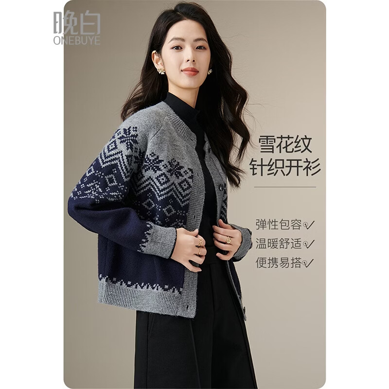 晚白【新品】冬款时尚复古慵懒风上衣撞色雪花纹大码针织开衫女 蓝灰色 M