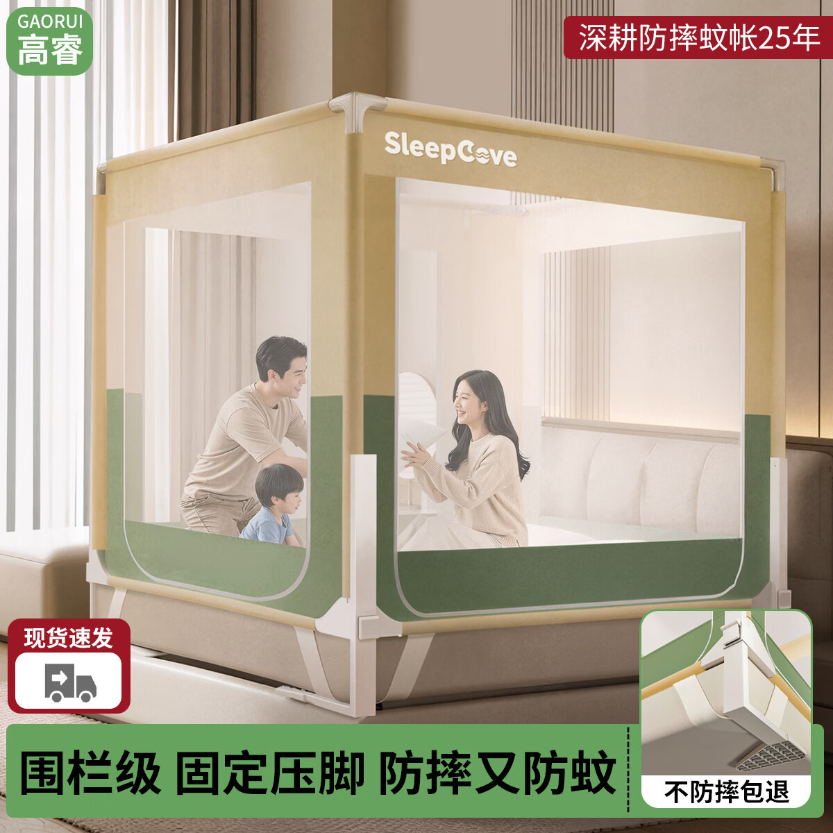 高睿防摔蚊帐升降一体床围栏婴儿家用卧室防止掉床儿童全罩式全底纹帐 海军蓝【护栏蚊帐两用-可调节加粗卡扣三通】 200cm*220cm*170cm 【升级大脚托才是真防摔】