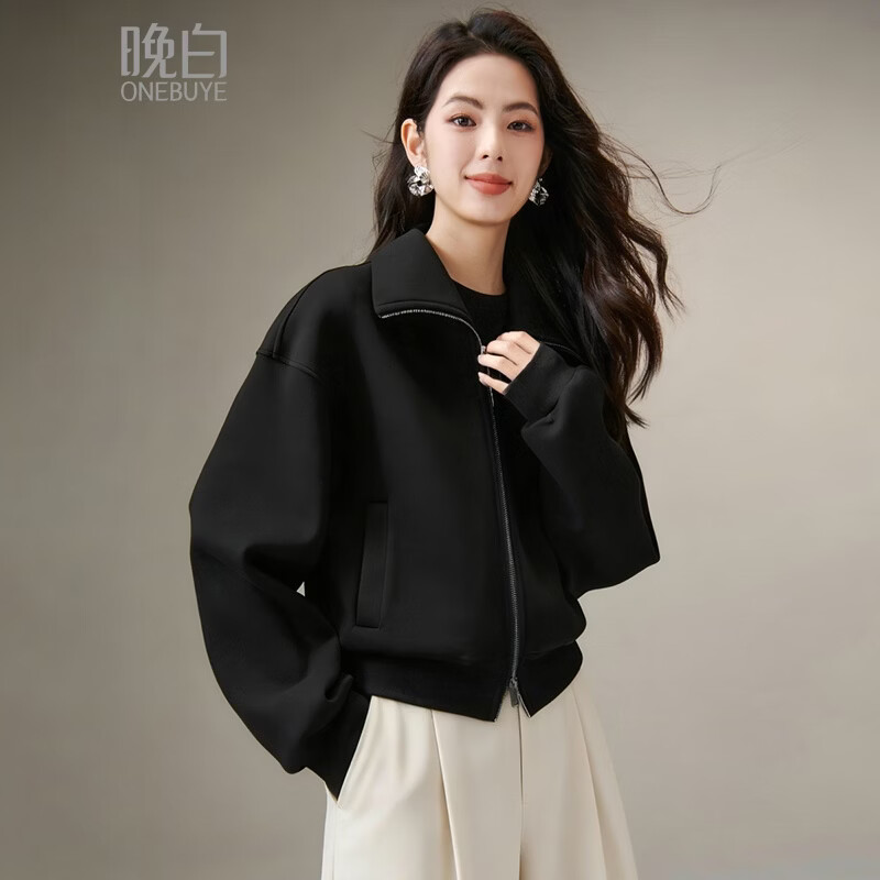 晚白【断码清仓】翻领气质拉链上衣宽松大码气质百搭卫衣外套女 黑色 M