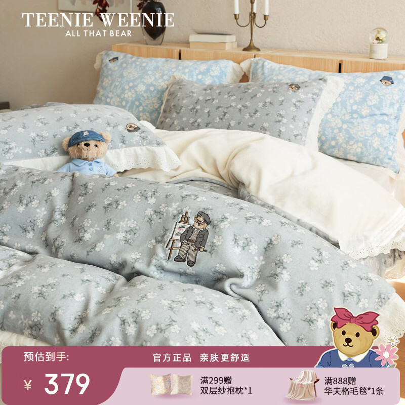 Teenie Weenie小熊A类少女粉碎花牛奶绒保暖四件套法式蕾丝花边被套加厚三件套 小熊慕斯系列-青绿 1.5/1.8m 床单款 被套200*230cm 四件套
