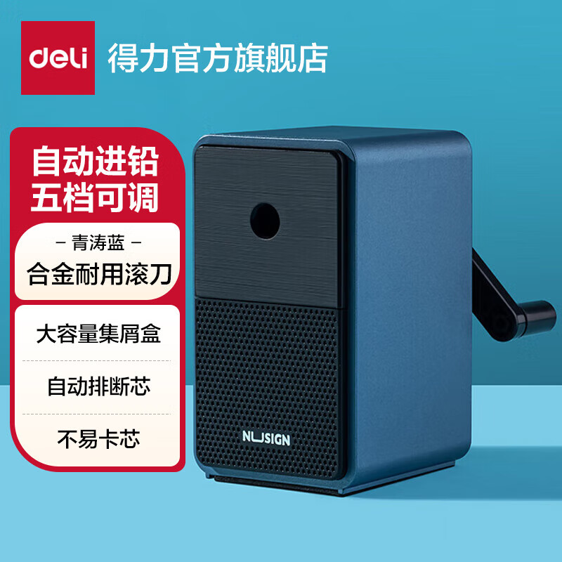 得力(deli)纽赛手摇削笔机学生削笔机 粗细可调转笔刀 自动进笔卷笔刀 手摇削笔器铅笔刀便携文具 青涛蓝【自动进铅_五档可调】