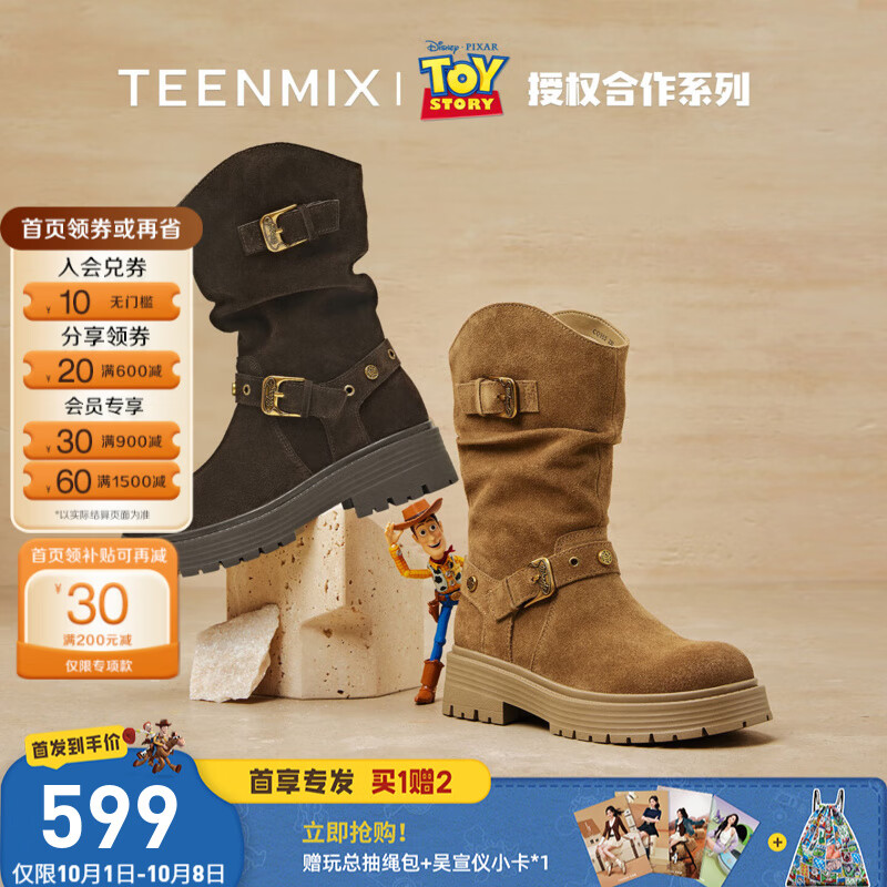 天美意吴宣仪同款玩具总动员联名黄金V西部靴复古厚底堆堆靴 棕色 32