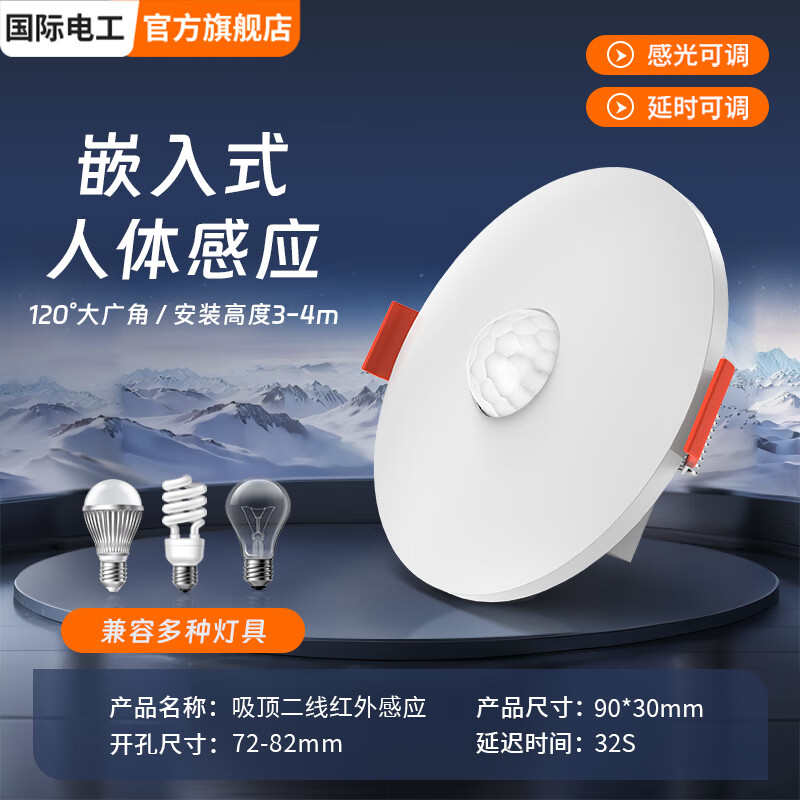 国际电工光感吸顶灯家用嵌入式人体感应开关大功率LED灯节能延时声控感应 150W-人体感应【二线制】