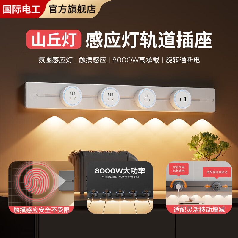 国际电工明装触摸感应灯轨道插座可移动家用厨房客厅导轨插座大功率滑轨插 浅云白 USB+Type-c蓝灯适配器【无轨道】