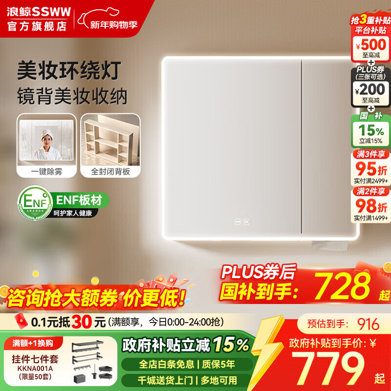 浪鲸(SSWW)卫浴收纳镜柜美妆储物镜柜卫生间组合一体盆智能除雾感应灯带背板 【环绕灯智能美妆除雾镜柜】80cm