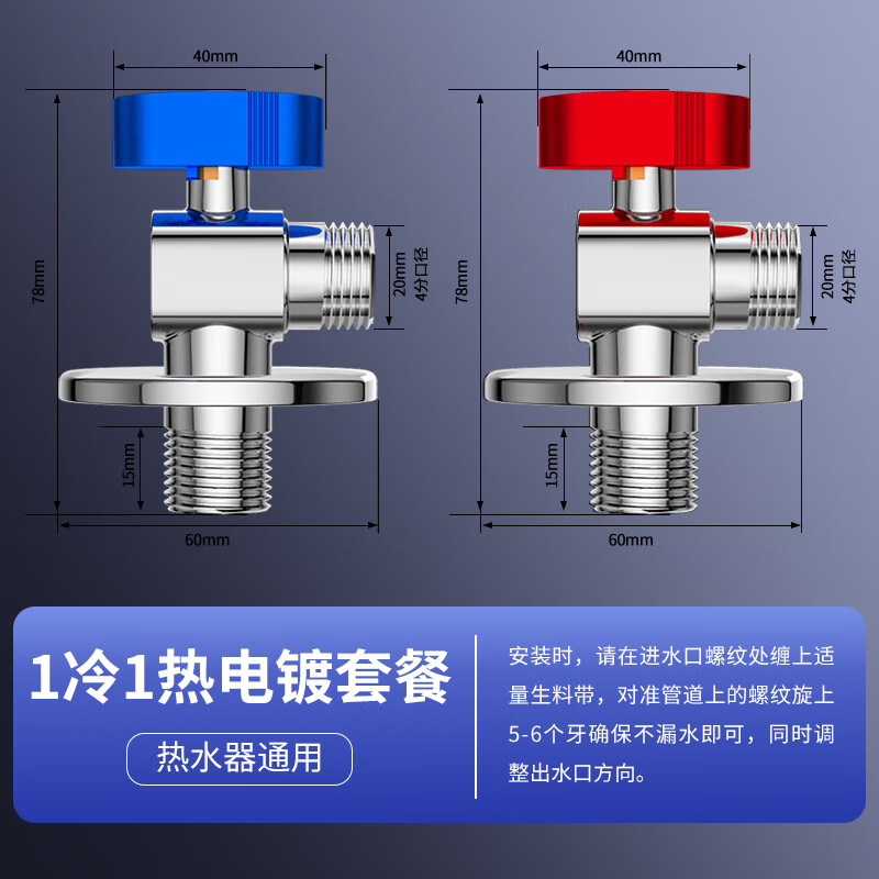 Jeonestan全铜球阀大流量冷热水4分燃气热水器专用三角阀门大通径球芯开关 【电镀红蓝】大流量球阀2只装