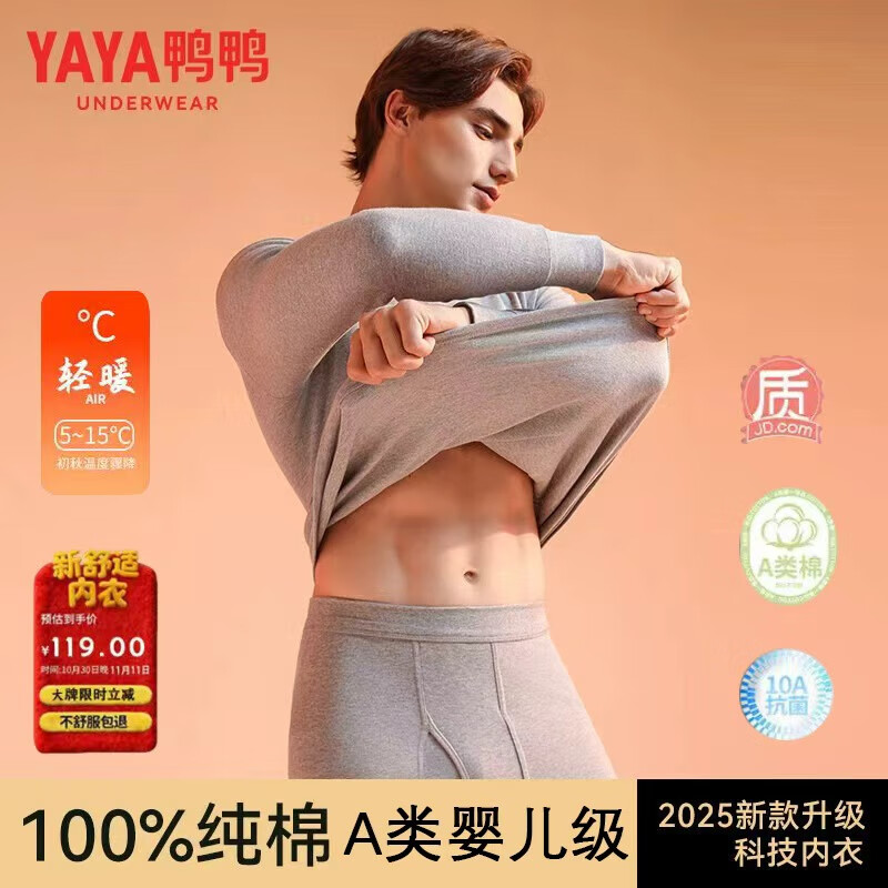 鸭鸭保暖内衣男士新疆长绒棉100%纯棉10A抗菌舒适加厚秋衣秋裤套装
