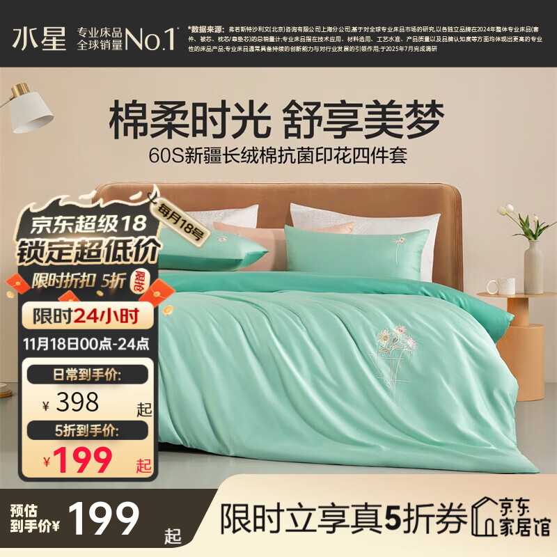 水星家纺床上四件套 60支长绒棉纯棉面料 轻奢法式全棉套件 被套床单枕套 向阳(60支长绒棉+礼盒装) 1.5米床 床单款 (被套200*230cm)