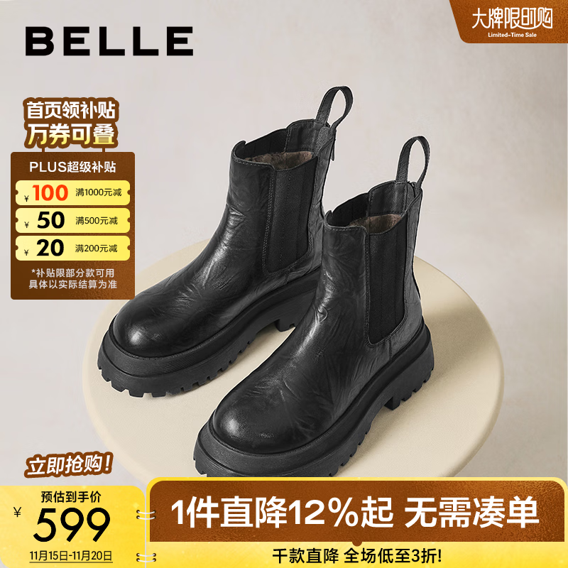 百丽(Belle)百搭切尔西靴女2025冬新商场同款厚底增高休闲短靴E7R1DDD5 黑色 37
