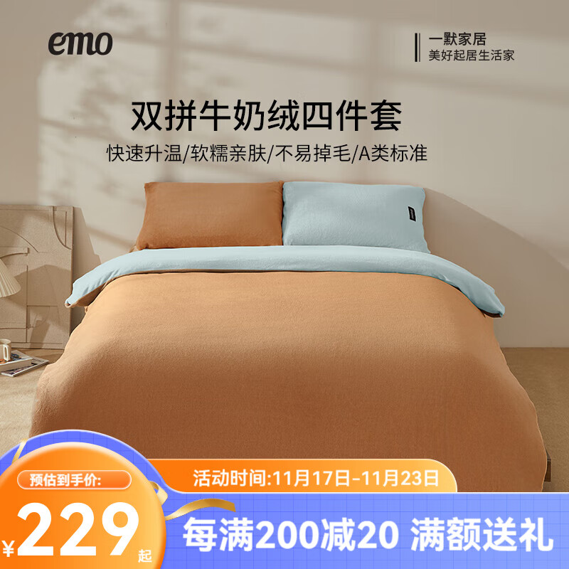 一默四件套冬季牛奶绒双拼床单被套枕套绒保暖A类亲肤床上用品四套件 秋橘初霁 床单款 (被套200*230cm)