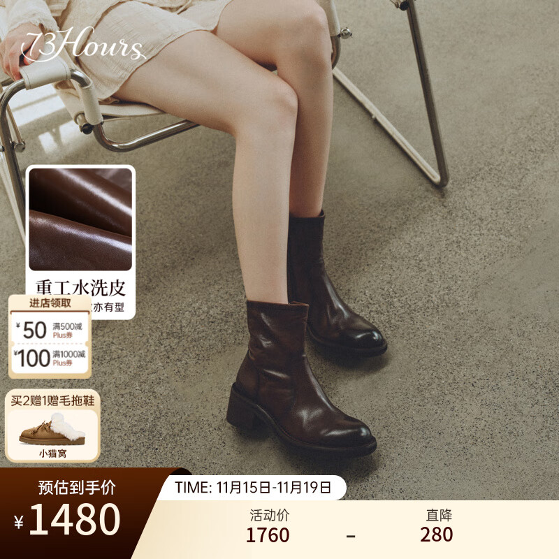 73Hours姜妍同款女鞋电影画面25冬季新款水洗皮切尔西靴弹力靴短靴瘦瘦靴 咖色 【白鹿同款/建议拍大一码】 37
