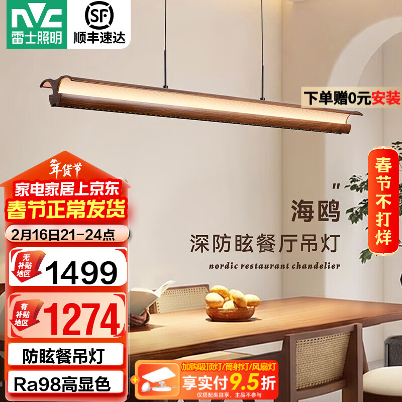 雷士(NVC)中古风胡桃木色智能餐厅吊灯现代简约护眼防眩岛台吧台灯 【海鸥胡桃木色】全光谱60W防眩智能1.3m