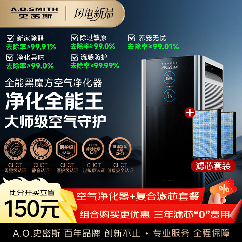史密斯(A.O.SMITH)【套装立省150】全能黑魔方空气净化器KJ950F-D11+原装滤芯IF-082套装 除甲醛除异味过敏原细菌 【套装】空气净化器+配套原装复合滤芯 组合购买更优惠