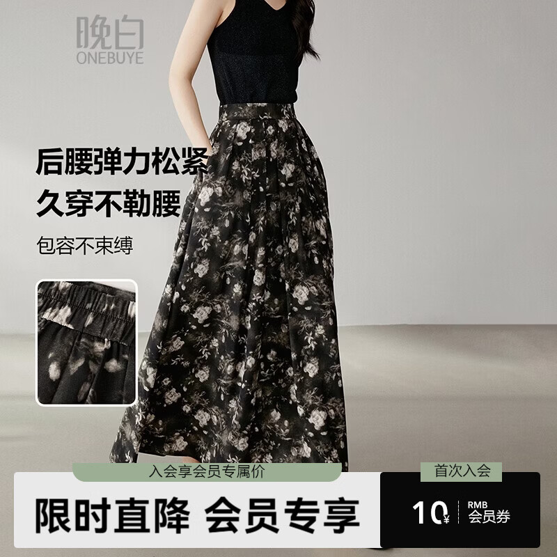 晚白【新品】2026年夏款时尚复古文艺风长裙雪纺印花减龄大摆半身裙 黑色 M