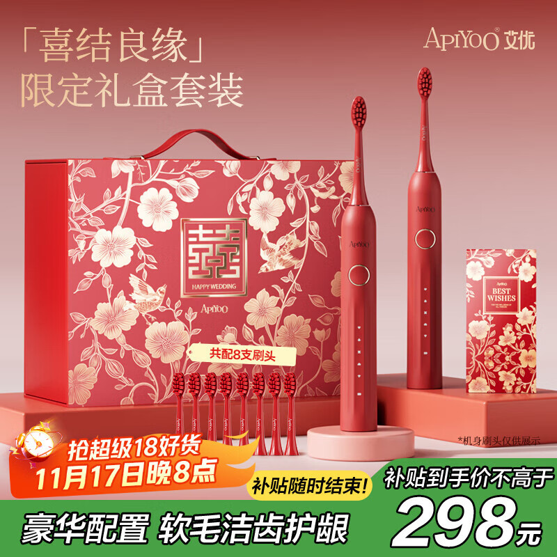 ApiYoo艾优Y1套装成人情侣电动牙刷2支装一对 超声波深层清洁 送男女朋友情侣新婚结婚订婚礼物喜结良缘