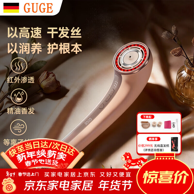 谷格(GUGE)德国高速护发吹风机【新款红外精油等离子三合一】家用静轻音负离子大功率不伤发电吹风男女风筒