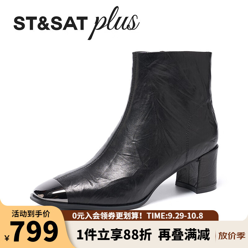 St&Sat星期六粗跟短靴2025冬款侧拉链时装靴时尚百搭切尔西靴SSD4116586 黑色 34