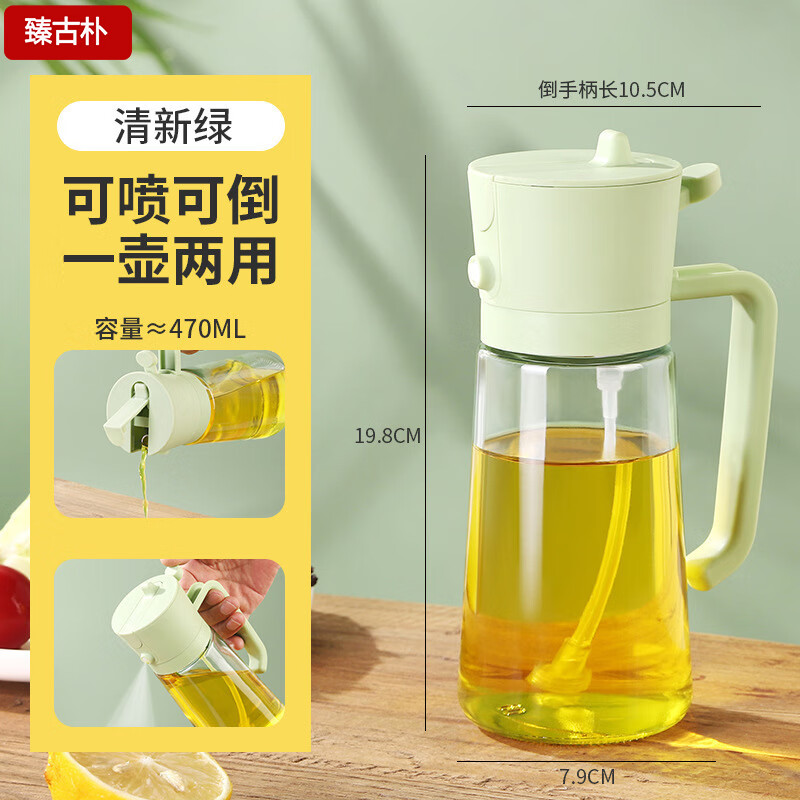臻古朴油壶喷雾倒油喷油一体两用雾化食用油玻璃油壶厨房家用不挂油 喷倒两用油壶470ml【绿色】