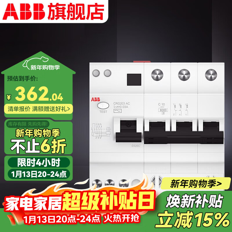 ABB断路器 新一代CR系列3P空开带漏电保护器6000安高分断 AC型 3P 10A带漏保