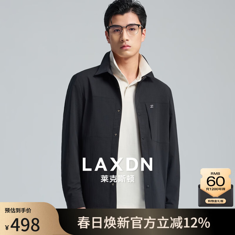 莱克斯顿外套男春夏新款衬衫式夹克外套商务休闲宽松翻领上衣男装 深黑 L