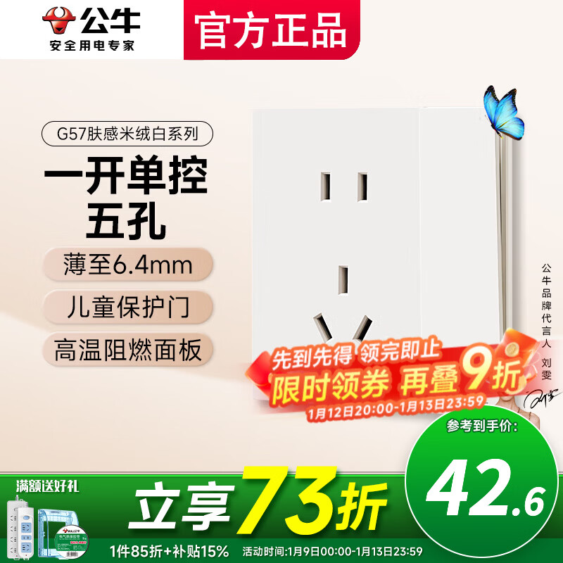 公牛(BULL)开关插座面板全屋套装G57米绒白大师系列蝶翼超薄空调五孔USB插座 五孔+一开单控【g57米绒白】