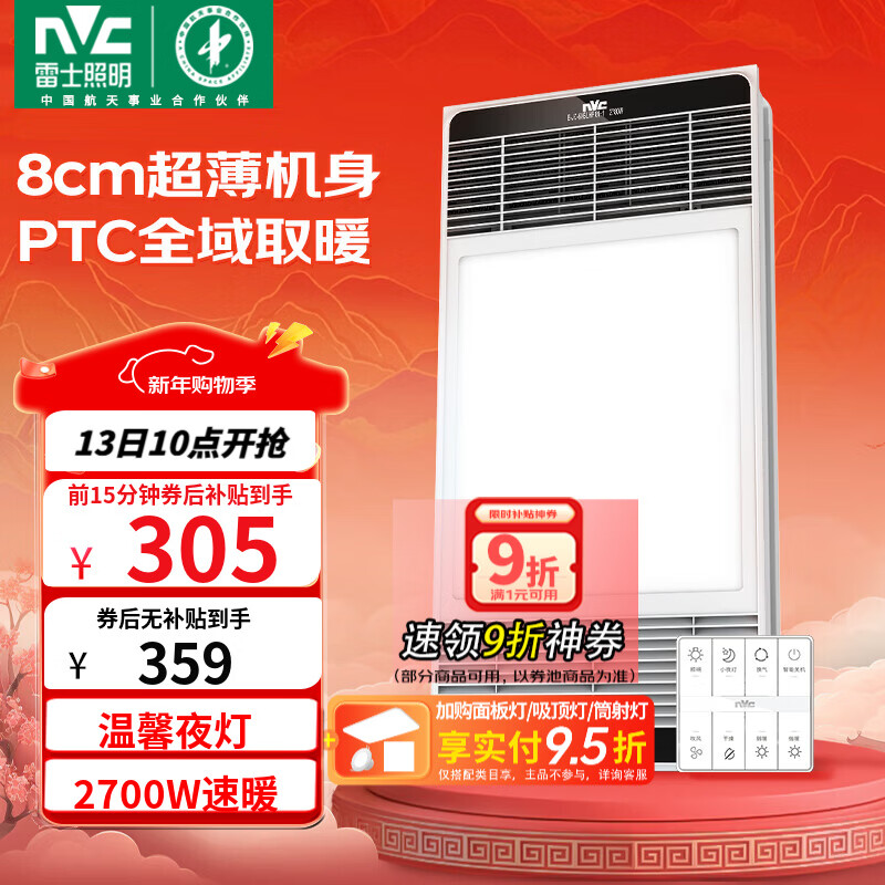 雷士(NVC)浴霸风暖大功率集成吊顶暖风机排气扇照明灯一体卫生间浴室Y295 【2700W】8cm轻薄机身