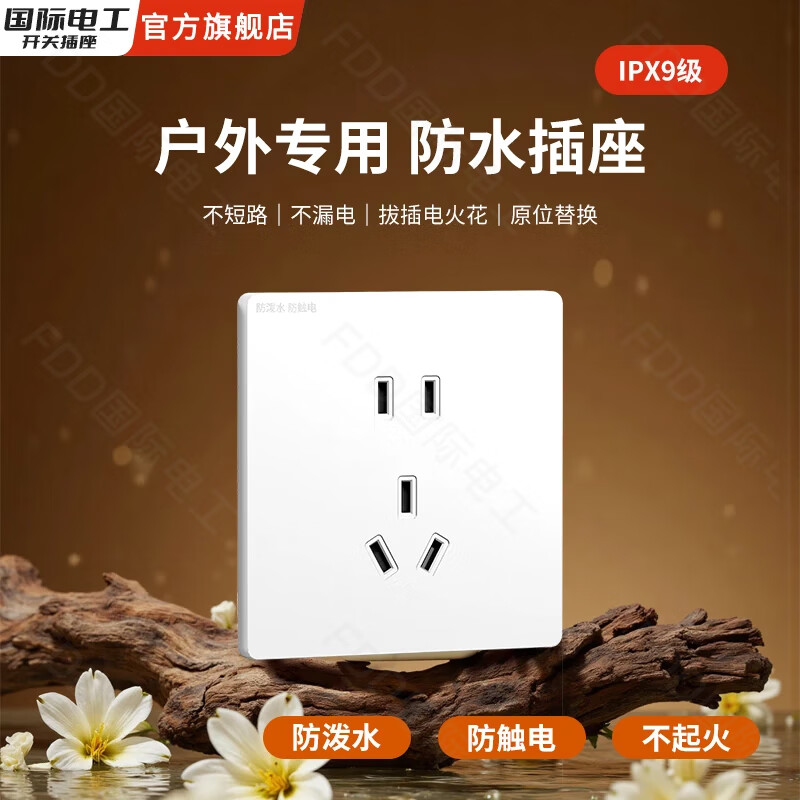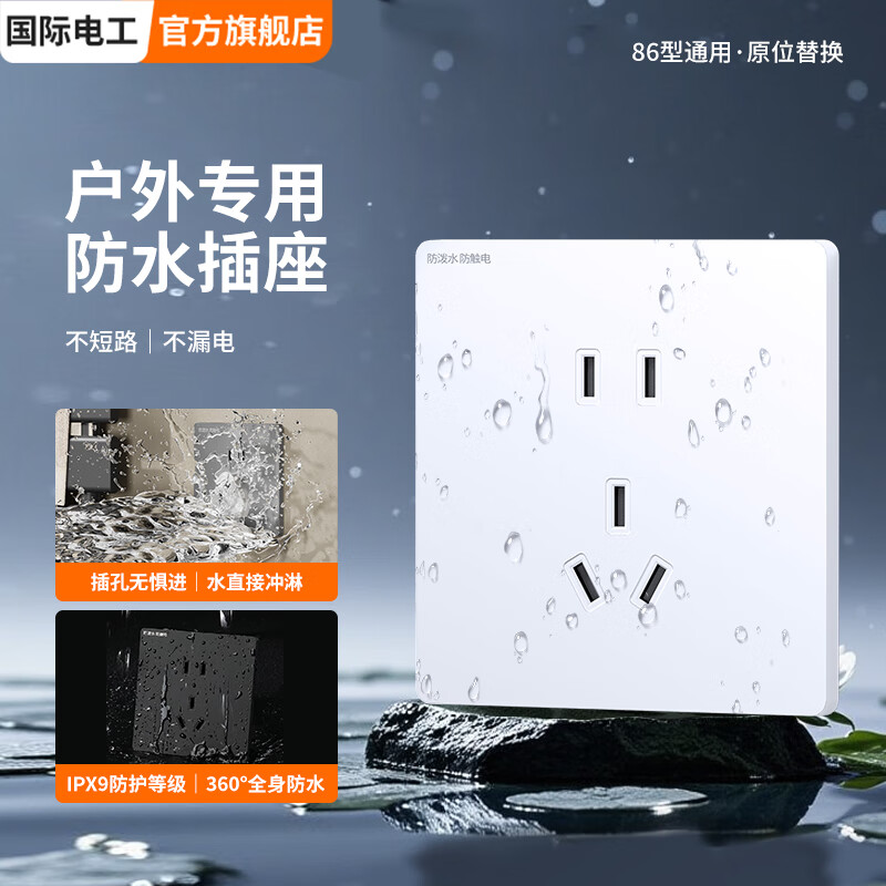 国际电工86型防水暗装智能插座IPX9户外庭院花园卫生间防漏电10A专用 86型白色 五孔防水插座-IPX9