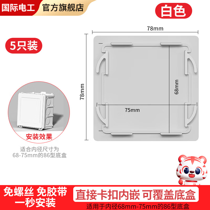 FDD国际电工免钉螺86型暗装底盒盖板加厚通用型开关插座卡扣式开关安装线盒板 86型暗盒自扣盖板白色5片