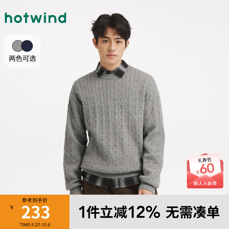 热风(Hotwind)男士针织衫毛衣2025年冬季新款老钱风绞花针织衫保暖打底毛衣 09灰色 S