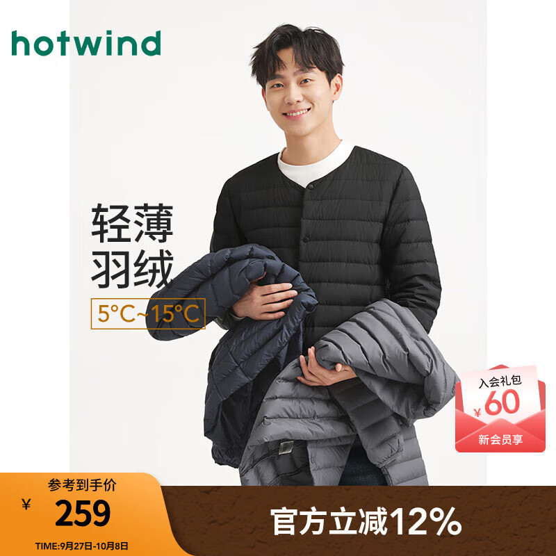 热风(Hotwind)【商场同款】男士轻薄羽绒服2025年冬季新款圆领轻薄内搭羽绒外套 01黑色 S