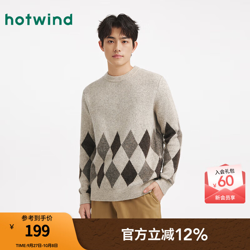 热风(Hotwind)男士圆领毛衣2025年冬季新款时尚撞色针织衫百搭内搭打底衫 125杏灰 S
